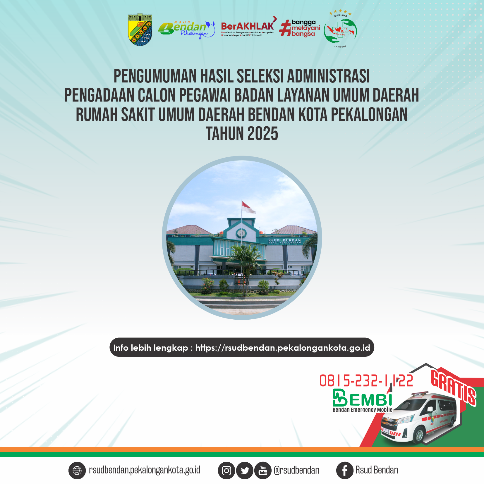 PENGUMUMAN HASIL SELEKSI ADMINISTRASI PENGADAAN CALON PEGAWAI BADAN LAYANAN UMUM DAERAH RUMAH SAKIT UMUM DAERAH BENDAN KOTA PEKALONGAN 10 Oktober 2025 [10:51:02]